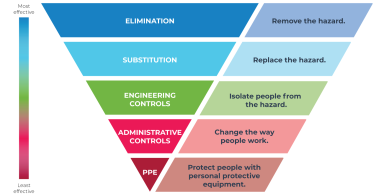 The first step to reducing exposure in your care home is to identify and assess tasks that may result in exposure to communicable disease. Be sure to involve staff and your JOHS Committee in this process. Then, using the hierarchy of controls, implement control strategies starting from the most effective control measures. Applying multiple control strategies is the most effective.