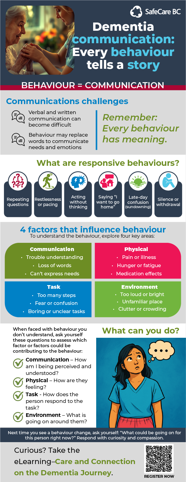 Understanding and responding to the communication challenges of dementia can be transformational. Our easy-to-digest infographic, "Dementia communication: Every behaviour tells a story," provides essential guidance for caregivers and family members. Learn why behaviour replaces words, identify common responsive behaviours like restlessness or repeating questions, and explore the four key factors—Communication, Physical, Task, and Environment—that influence these actions. Use our simple checklist to assess a situation with curiosity and compassion, leading to better connection and care.