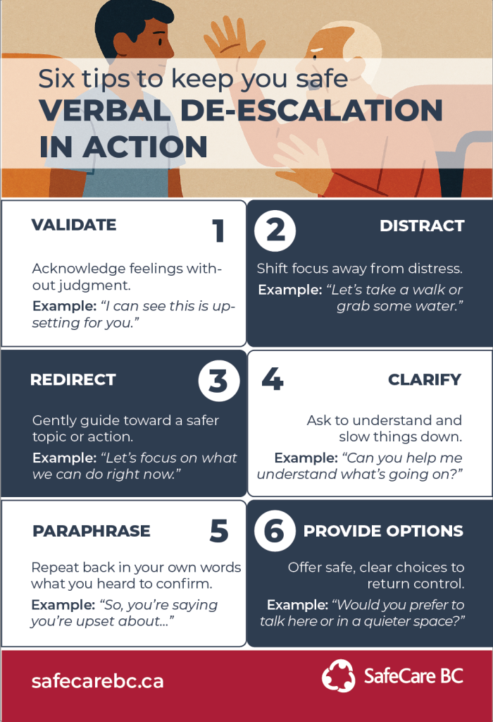 When emotions run high, knowing how to respond calmly and effectively is crucial for safety. Six tips to keep you safe: Verbal De-escalation in Action provides an immediate guide to managing tense situations. Learn and apply the six powerful techniques—Validate, Distract, Redirect, Clarify, Paraphrase, and Provide Options—each with practical examples to help you maintain control and guide an interaction back to a safe, productive space. Master these skills to enhance safety for yourself and those around you.