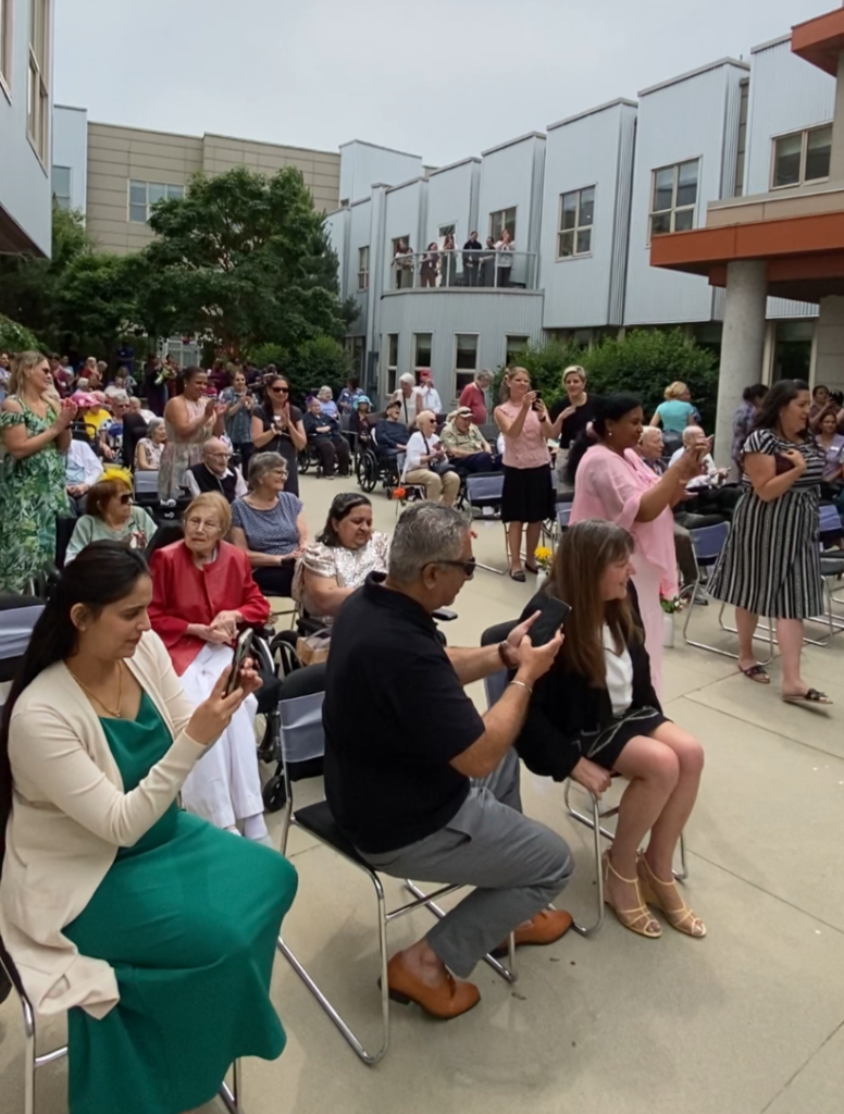 Then, on June 11th, 2025, I had the privilege of witnessing something unforgettable. Sunlight spilled across our courtyard, where chairs were arranged in a circle of warmth and belonging. Flowers softened the space with their fragrance, and soft music drifted through the air. The courtyard filled as residents, staff, and family came together to celebrate a love commitment ceremony for Janice and Roy. It was a moment that felt both deeply personal and larger than life.