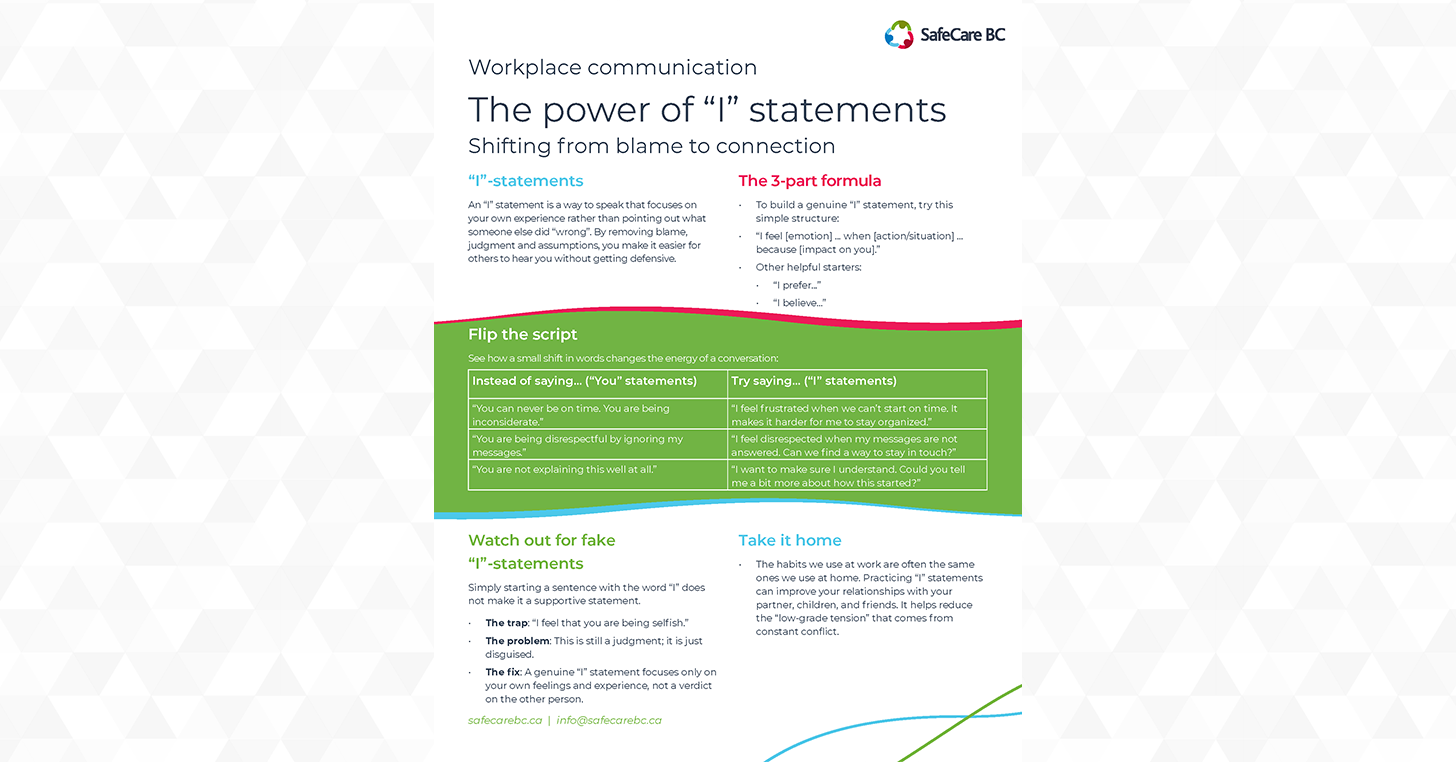 Use this info sheet to learn how “I” statements can be used to shift your workplace communication from blame to connection.